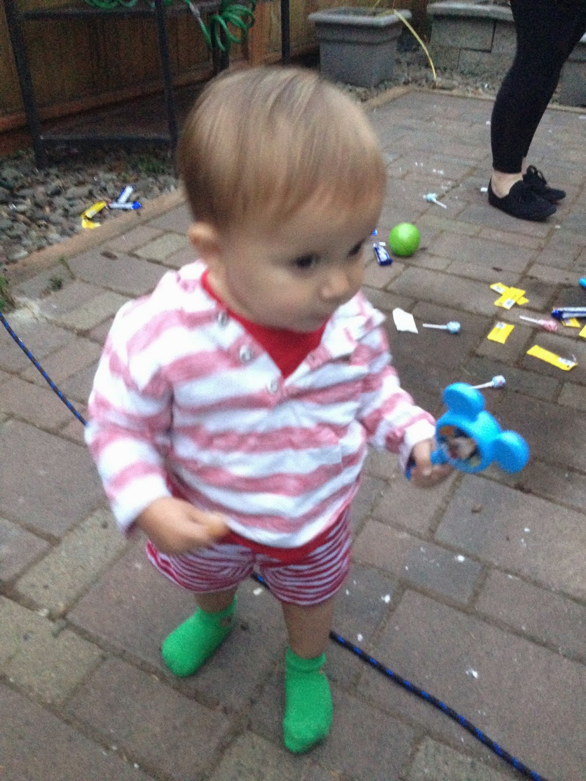 | In reality, Oliver got super sad as we hit the pinata. But he loved to look up at his papa. |